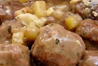 - En una cazuela con un chorrito de aceite, dorar 2 dientes de ajo laminados y 1 hoja de laurel. Cuando estén dorados, echar 1 cuch. de harina, mover y añadir ½ vaso de vino blanco. Dejar que espese y echar ½ vaso de agua. Dejarlo cocer y añadir las albóndigas, dejándolo que hierva todo junto unos minutos. Servir con patatas fritas en cuadraditos y con huevo cocido picado.