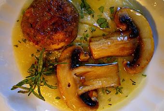 Añadir a la crema espesa de puerro un poco del agua de la cocción hasta conseguir la textura deseada y la ponemos en el plato a servir. Colocar encima las albóndigas y decorar con las setas laminadas hechas a la plancha. Yo regué con un chorreoncito de aceite de oliva y de menta picada para realzar aún más los sabores.