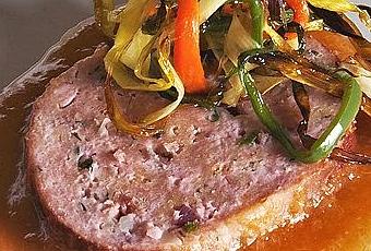 - Finalmente, servimos las rodajas de albondigón regadas con la salsa y acompañadas con las verduras.