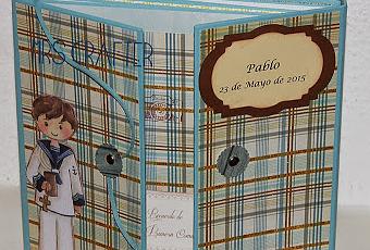 Aquí sigo haciendo álbumes de comunión( quedan aún unos cuantos).En esta ocasión,B. me pidió que hiciera uno para niño, que no desmerece en absoluto los modelos femeninos.Encuadernación de armario, 22 x22, con 8 hojas/sobres en el interior, colores azules y naranjas, una combinación preciosa. Decoración, papeles de Dayka, divinos.Sobres, bolsillos, tarjetas, etiquetas para que el niño escriba...