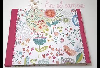 El papel de flrores y pajaritos me encanta para niños, es original, colorido y con unos dibujos naïf que me parecen monísimos. He troquelado los bordes con un motivo de blonda y para coser el lomo, hilo grueso rosa pálido. El interior es cartulina verjurada color crema, sin adornos, porque el papá es fotógrafo y le va a dar todo el protagonismo a las fotos de la peque.