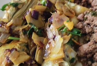 Cuando esté dorado añadir las alcachofas y echarle un poco de sal y el jamón serrano.