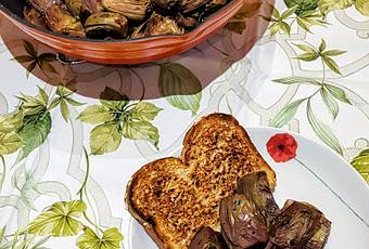Cuando esté todo listo ponemos las alcachofas en un plato hondo y servimos con las rebanadas de pan frito.
