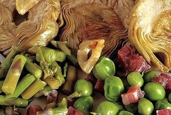 En esta época, primavera, llegan los primeros productos frescos de la huerta, lo que hace que no sólo sean más sabrosos al estar en su temporada natural sino que suelen ser más baratos. Por eso, y para disfrutar de su alto valor nutritivo, es buena ocasión aprovechar para traer tres de los productos de temporada más delicados, y ponerlos juntos en un plato que hará las delicias de sus comensales. Una preparación tan sencilla como saludable que al estar hecha al vapor y con unos tiempos de cocción mínimos respeta los sabores y los realza. Porque los guisantes tiernos y los espárragos trigueros apenas necesitan cocinado, y las alcachofas a la plancha guardan todo su sabor que el ajo subraya. Si añadimos un toque de jamón ibérico, tendremos una receta para chuparse los dedos.Ingredientes para cuatro personas4 - 6 alcachofas, según tamañoDos manojos de espárragos verdes (mejor no muy gruesos)500 gr de guisantes tiernos4 dientes de ajo75 gr de picadillo de jamón ibérico SalAceite de oliva