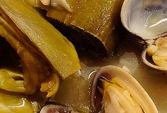 Calentamos aceite en una cacerola y empezamos por dorar un poco los ajos. Añadimos la harina, removemos, agregamos el jamón muy picado y las almejas. Tapamos y cuando se empiecen a abrir añadimos el vino. Agitamos la cazuela a partir de este momento para ligar la salsa.