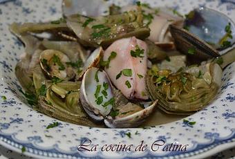 12 alcachofas1/2 kgr de almejas (o chirlas)1/2 kgr de chipironesuna cebollaun diente de ajo2 cucharadas de harinauna cucharada de perejil picadoun limón5 cucharadas de aceite olivasal y pimienta