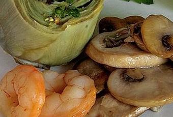 - Colocamos en el plato el salteado de champiñones y gambas, y sobre ellos, aliñadas con la mezcla de ajo, perejil y aceite de oliva y un poco más de sal si se quiere, los corazones de alcachofa. Servimos y disfrutamos.