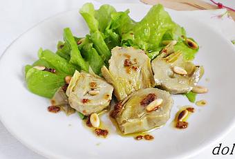Emplatar poniendo un poco de lechuga, las alcachofas partidas por la mitad, salsear y añadir unos piñones.