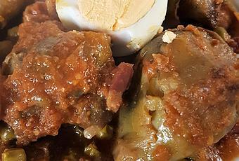 En mi tierra se prepara una comida de patatas y huevo, es un guiso muy rico que lleva además de patatas y huevos cocidos, alcachofas (alcaciles) y guisantes (pesoles), es un guiso que en mi casa se hacía tanto con huevos, con carne de pollo, de cordero y también con bacalao, un mismo fondo con distintos actores principales.
