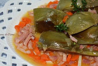 Retiramos las hojas externas de las alcachofas, dejándoles un tallo de 2 o 3 centímetros. Las cortamos en cuartos y las ponemos con agua y zumo de limón en un bol.En una sartén ponemos el aceite a calentar y rehogamos la cebolla, el ajo, la zanahoria y el beicon.