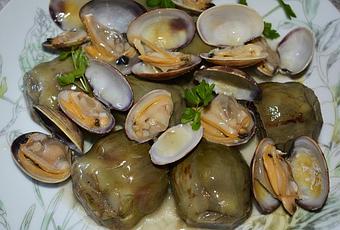 12 alcachofas500 gr de almejas (pueden ser chirlas)2 dientes de ajoharina1 limónvino blancoaceite y salPreparación:
