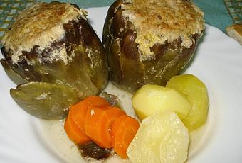 - Rellenamos las alcachofas con la carne, apretando bien la misma hacia el fondo.