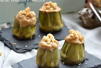 En estas fechas las verduras también están presentes en nuestra mesa y si hay una verdura que alcanza su esplendor en esta época es la alcachofa. Así que no he dudado en vestirlas un poco de fiesta y convertirlas en unas deliciosas Alcachofas Rellenas de Crema de Boletus y Nueces, no ha quedado ni una. De haber quedado alguna de ellas tonteando por el plato, prometo que me la hubiese comido yo, es verdadera pasión la que siento por ellas. ¡Ay, si no fuera por que obtener estos corazones cuesta un poquito!