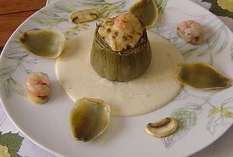4 alcachofas grandes u 8 pequeñas150 gr de champiñonesuna cebolletazumo de un limón40 gr de queso rallado (al gusto)200 gr de colas de gambas20 gr de mantequillauna cucharada de harinaun vaso de caldo de pescadoun vaso de natauna cucharada de brandypimienta negra, sal5 cucharadas de aceite de oliva
