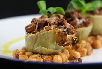 Comenzaremos limpiando las alcachofas, que es la parte más tediosa de la receta. Para ello quitamos el tallo y las hojas externas que son las más duras. Cortamos la punta de la alcachofa y untamos esta con limón para que no ennegrezca, abriendo bien la alcachofa para poder rellenarla luego. Ponemos en un bol lleno de agua con limón mientras limpiamos el resto. Una vez limpias todas, escurrimos y ponemos en una cacerola cubiertas con agua salada, dejamos cocinar a fuego suave unos 20 minutos hasta que estén tiernas. Escurrimos, secamos el exceso de agua con papel absorbente y reservamos.Preparamos ahora el relleno, para ello, picamos la carne en la Thermomix, a velocidad ascendente de 5 a 10 durante 6 segundos. Si no tenemos no pasa nada, podemos picarla con el robot de la batidora o a cuchillo, o bien pedírselo al carnicero.Pelamos una cebolla y un diente de ajo y los troceamos bien finitos. Los ponemos a pochar en una sartén con aceite y sal. Una vez transparentes, añadimos la carne, salpimentamos y rehogamos todo un par de minutos. Pasado este tiempo, añadimos el vino y subimos el fuego hasta que reduzca. En ese momento añadimos el tomate frito y dejamos cocinar durante 5 minutos a fuego suave.Troceamos la otra cebolla bien fina y la ponemos a pochar en una sartén con aceite y una pizca de sal para ayudar al pochado. Una vez transparente añadimos los garbanzos y los freímos a fuego bien fuerte. Añadimos un poco de agua para que no salten, y cuando estén tostaditos los retiramos del fuego y los regamos con un buen chorro de aceite de boletus.Procedemos ya a rellenar las alcachofas poniendo una cucharada de relleno de carne y apretando bien para que quede compacto. Una vez rellenas todas, espolvoreamos con queso manchego rallado y ponemos en el horno a gratinar hasta que el queso se haya fundido, es decir, unos cinco minutos, más o menos. Por últimos servimos nuestro plato poniendo una cama de garbanzos y encima las alcachofas rellenas. Terminamos con un chorrito de aceite de boletus y unas hojas de albahaca fresca.