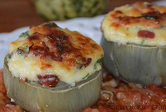 Saltear el jamón en una sartén con unas gotas de aceite.Batir el huevo, añadir el jamón, perejil picado, el queso chafado con un tenedor, sal y pimienta. Con esta mezcla, cubrimos las alcachofas.
