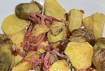 INGREDIENTES:- 1 kg. de alcachofas pequeñas- 2 patatas medianas- 50 gr. de hilos de jamón curado Espuña (1 barqueta)- 2 dientes de ajo- Aceite y salPREPARACIÓN:- Pelar y cortar a trozos las patatas.- Freir en abundante aceite y escurrir sobre papel absorvente.- Limpiar las alcachofas (dejarlas enteras) y salar.- Dorar los ajos en una sartén con un poco de aceite e incorporar las alcachofas, saltear.- Cuando las alcachofas estén doradas, incorporar, a fuego suave, las patatas y los hilos de jamón hasta que estos se tuesten un poquito.- Servir y ¡disfrutar!.Hasta mañana!!