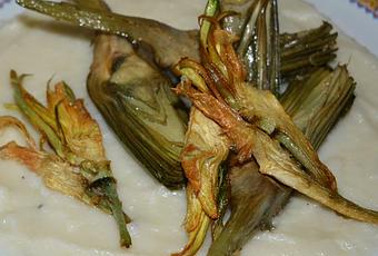 Para servir, cubrimos el fondo de un plato con unas cucharadas del pil-pil de coliflor y sobre éste, colocamos las alcachofas confitadas. Adornamos con las alcachofas fritas.