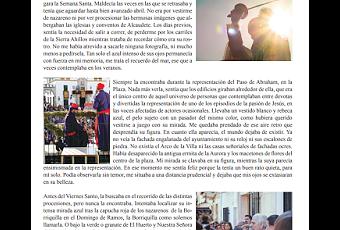 Por fin llegaba el Viernes Santo, cada año esperaba el momento con una mezcla de desazón y alegría, temía que no se presentara a nuestra cita, que me dejara plantado bajo el balcón de la plaza donde se representaba el Paso de Abraham. Antes había recorrido el resto de los pasos, sin éxito alguno. Pasada la representación, ella se perdía entre la gente. Por más que intentaba seguirla por la calle Llana, me era imposible. Cuando por fin podía avanzar entre el gentío, mi musa ya había desaparecido. No me daba por vencido y me iba al encuentro de las procesiones que salían ese día: San Elías, Nuestro Padre Jesús Nazareno, la Santa Verónica, la Virgen de los Dolores, y por la noche, el Santo Entierro yla Soledad. El sábado descansaba en mi casa, ya dada por perdida mi misión de búsqueda. El Domingo de Resurrección conseguía reunir fuerzas para buscar entre nazarenos y devotos su amado rostro. Cuando se encerraba el paso en la iglesia de San Pedro, yo me iba a enclaustrarme en mi habitación para sufrir en silencio mi mal de amores.