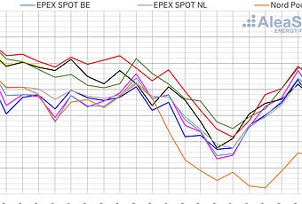 Este 2020, los precios de los mercados mayoristas de electricidad en Europa han estado claramente marcados por la caída de la demanda, a causa de las medidas de confinamiento y restricción de la actividad económica para contener la expansión del a COVID‑19, y por la caída de los precios de gas, que en parte también es causa de la crisis de la COVID‑19 pero que ya estaban en claro retroceso desde finales de 2018. Los precios estuvieron claramente a la baja durante la primera mitad del año, con caídas importantes en febrero, pero sobre todo en abril, donde el retroceso de los precios rondó el 40% en los mercados EPEX SPOT de Francia y Bélgica y en el mercado ibérico MIBEL, y estuvo alrededor del 23% en los mercados EPEX SPOT de Alemania y Países Bajos, en el mercado italiano IPEX y el británico N2EX. A falta de los datos de los últimos tres días de mercado del año, el precio promedio de 2020 se situará entre los poco más de 30 €/MWh de Alemania y los cerca de 40 €/MWh en Gran Bretaña e Italia, exceptuando el mercado de los países nórdicos. Estos promedios anuales representan una caída de alrededor del 20% respecto a 2019 para los mercados del centro del continente. Para los países del sur de Europa, esta caída se sitúa cerca del 30%. Para la mayoría de mercados, los precios de este año se situarán como los más bajos al menos desde 2004. Por su parte, el mercado Nord Pool de los países nórdicos ha estado muy desacoplado del resto de mercados europeos. El precio promedio de 2020 acabará por debajo de los 11 €/MWh, el precio más bajo, con diferencia, al menos de la última década. Futuros de electricidad