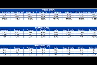El mercado MIBEL de España y Portugal fue el que menor bajada registró entre las dos semanas analizadas, con decrementos del 8,3% y el 7,5% respectivamente. Mientras tanto, en el resto de mercados las variaciones en el precio promedio semanal se situaron entre el ‑12% y el ‑21%.