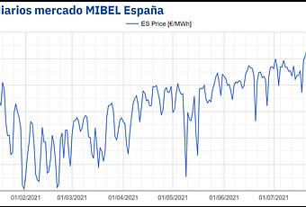Los precios de los derechos de emisión de CO2 marcaron su récord histórico el 5 de julio, con un valor de 57,77 €/t y el precio de cierre de la sesión del 10 de agosto fue 57,34 €/t, muy cercano a dicho récord. El gas TTF marcó su récord histórico en el mercado spot a inicios de 2018, pero igualmente el precio del 11 de agosto, de 44,40 €/MWh es el más alto de los últimos tres años. Este valor está muy cercano a los 44,66 €/MWh con los que cerró el mercado de futuros de gas TTF para el M+1 en el mercado ICE en la sesión del 10 de agosto, que es el máximo histórico desde octubre de 2013. Por su parte, los precios del mercado MIBGAS tuvieron un máximo en enero de 2021, y tras una aparente recuperación en febrero, iniciaron también una tendencia al alza que ha llegado a la sesión del 10 de agosto con un precio de 43,58 €/MWh, valor muy similar al del gas TTF.