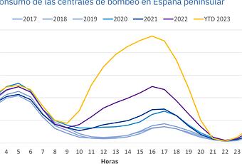 Desde 2020, este perfil de consumo centrado en las horas de la madrugada empezó a cambiar. A medida que el incremento de producción fotovoltaica empezaba a presionar los precios en las horas centrales del día hacia valores más bajos, el bombeo empezó a consumir más en esas horas, y en lo que se lleva de 2023, el perfil ya está prácticamente invertido, con la mayor parte del consumo concentrado en las horas con mayor producción solar.