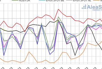 La mayoría de los mercados, con la excepción del mercado italiano y el mercado nórdico, registraron precios horarios cero o negativos durante el fin de semana. El mercado británico registró los precios más bajos el sábado 28, con -3,90 £/MWh entre las 4:00 y las 7:00. El precio horario más alto de la semana fue de 215,02 €/MWh, registrado en el mercado ibérico entre las 20:00 y las 21:00 del lunes 23. Este es el precio horario más alto de los últimos diez meses, con la excepción de los 220,00 €/MWh registrados el lunes de la semana anterior.