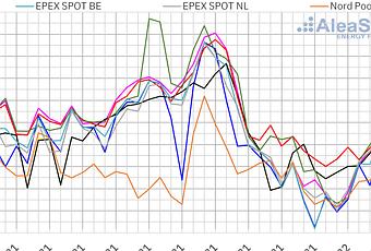 En la primera semana de enero, casi todos los mercados analizados alcanzaron precios promedio semanales superiores a 150 €/MWh. Las excepciones fueron el mercado Nord Pool y el mercado alemán, con promedios de 123,19 €/MWh y 144,52 €/MWh respectivamente. Por otra parte, el precio promedio semanal más elevado, de 208,53 €/MWh, fue el del mercado IPEX. En el resto de los mercados, los precios se situaron entre los 159,45 €/MWh del mercado belga y los 191,59 €/MWh del mercado británico.