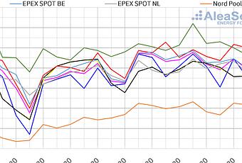 Los precios bajaron durante los primeros cuatro días de la cuarta semana de octubre en la mayoría de los mercados eléctricos europeos, por el aumento de la producción eólica. Otro factor que propició estos precios más bajos fue el descenso de los precios del CO2, que bajaron de los 24 €/t, algo que no pasaba desde junio. Los precios del gas superaron los 14,50 €/MWh durante la semana. Se espera que en la última semana del mes los precios vuelvan a subir al disminuir la producción eólica