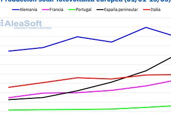 En España peninsular se generaron 12,5 TWh con solar fotovoltaica entre el 1 de enero y el 15 de mayo de 2023, que comparado con el mismo período de 2022 supuso un aumento de un 45%, y respecto a 2018, de un 404%. En Francia se generaron 6,8 TWh, aumentando un 26% respecto a 2022 y un 135% respecto a 2018. En Italia, la solar fotovoltaica aportó 7,8 TWh al mix de generación hasta mediados de mayo de 2023, situándose un 1,0% y un 53% por encima de lo producido en igual período en 2022 y 2018, respectivamente. En Portugal se generaron 1,3 TWh con solar fotovoltaica, incrementándose un 47% respecto a 2022 y un 363% respecto a 2018.