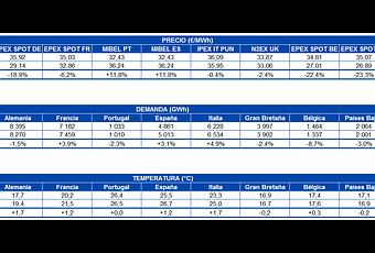 La semana del 20 de julio, los precios fueron inferiores a los de la semana del 13 de julio en la gran mayoría de los mercados eléctricos europeos analizados. La excepción fue el mercado MIBEL de España y Portugal, donde se registró un incremento del 12%. En cuanto a los descensos, el mercado con la mayor caída de precios, del 32%, fue el mercado Nord Pool de los países nórdicos, seguido por el mercado EPEX SPOT de los Países Bajos y el de Bélgica, con bajadas del 23% y 22% respectivamente. Mientras que el mercado donde los precios disminuyeron menos, un 0,4%, fue el mercado IPEX de Italia. En el resto de los mercados, las bajadas de los precios estuvieron entre el 2,4% del mercado N2EX de Gran Bretaña y el 19% del mercado EPEX SPOT de Alemania.