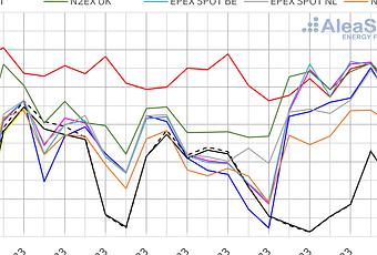 Por otra parte, el lunes 23 de enero, de 9:00 a 10:00, se alcanzó un precio de 270,00 €/MWh en el mercado francés y se superó esta cantidad en los mercados alemán, belga y neerlandés. En el caso del mercado británico, el día 23, de 18:00 a 19:00, se registró un precio horario de 255,06 £/MWh. Estos precios fueron los más altos del último mes en estos mercados.
