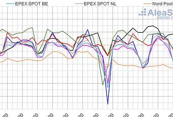 El mercado con el precio promedio más bajo en lo que va de semana, de 3,81 €/MWh, fue el mercado Nord Pool. Mientras que el mercado con el promedio más elevado, de 31,45 €/MWh, fue el británico, seguido por los mercados de Alemania y de los Países Bajos, con unos precios de 30,87 €/MWh y 30,55 €/MWh respectivamente. El resto de los mercados tuvieron precios promedio entre los 27,63 €/MWh del mercado ibérico y los 29,46 €/MWh del mercado belga.
