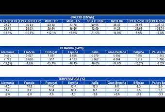 Como era de esperar, en la semana recién concluida la demanda eléctrica ha estado muy por debajo de la obtenida en la semana anterior en todos los mercados del continente europeo. El efecto de laboralidad de los festivos del 25 y 26 de diciembre ha causado en Alemania e Italia descensos del 19% y 17%, respectivamente. Las temperaturas medias fueron, en general, al menos 1 °C más bajas que las de la semana anterior, pero tuvieron menos influencia que el efecto de laboralidad. En Portugal la disminución fue del 16% al igual que en España. Al corregir el efecto de laboralidad en Alemania, Francia y España, se obtienen aumentos respecto a la semana del 16 de diciembre del 5,7%, 2,4% y 0,2% respectivamente.
