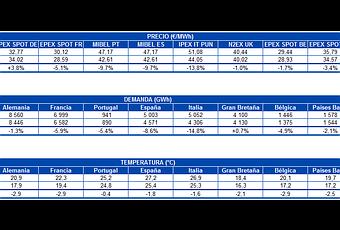 Los mayores retrocesos fueron en los mercados que normalmente tienen los precios más altos de Europa, el mercado IPEX de Italia, con un -14%, y el mercado MIBEL de España y Portugal, con un -10%, posicionándose ambos entre los 40 €/MWh y 45 €/MWh la pasada semana. El otro mercado que generalmente se encuentra en el grupo de mercados con precios más altos de Europa, el británico N2EX, bajó un -1,0% en el período analizado y, aunque empezó la semana con precios cercanos a los de dicho grupo, a finales de semana se aproximó a los precios de los mercados del grupo con precios más bajos. En el grupo de mercados con precios más bajos, que la semana pasada estuvieron entre 28 €/MWh y 35 €/MWh, se mantienen los mercados Nord Pool de los países nórdicos y EPEX SPOT de Alemania, Francia, Bélgica y Países Bajos.