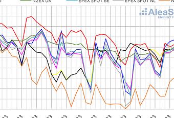 En la segunda semana de junio, los promedios semanales se mantuvieron por debajo de los 95 €/MWh en los mercados europeos. El precio promedio más elevado, de 93,76 €/MWh, fue el del mercado IPEX de Italia. Por otra parte, el menor promedio semanal fue el del mercado nórdico, de 34,19 €/MWh. En el resto de los mercados analizados, los precios se situaron entre los 74,21 €/MWh del mercado neerlandés y los 84,01 €/MWh del mercado británico.