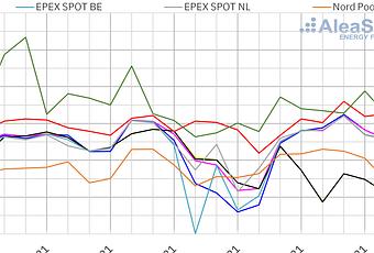 La semana del 15 de marzo, los precios de casi todos los mercados eléctricos europeos analizados en AleaSoft aumentaron respecto a los de la semana anterior. La excepción fue el mercado MIBEL de España y Portugal, con un descenso del 29%. Por otra parte, la mayor subida de precios, del 54%, fue la del mercado EPEX SPOT de Bélgica, seguida por la del mercado EPEX SPOT de Alemania, del 48%. En cambio, el menor aumento de precios, del 6,9%, fue el del mercado IPEX de Italia. En el resto de los mercados, las subidas de precios estuvieron entre el 9,2% del mercado N2EX del Reino Unido y el mercado Nord Pool de los países nórdicos y el 24% del mercado EPEX SPOT de Francia. En la tercera semana de marzo, el precio promedio semanal más elevado fue el del mercado N2EX, de 68,87 €/MWh, seguido por el del mercado italiano, de 61,87 €/MWh. Mientras que los menores promedios fueron los de los mercados portugués, español y nórdico, de 30,59 €/MWh, 30,62 €/MWh y 39,04 €/MWh respectivamente. En el resto de los mercados, los precios se situaron entre los 53,00 €/MWh del mercado alemán y los 54,01 €/MWh del mercado de los Países Bajos. Por otra parte, casi toda la tercera semana de marzo, los precios diarios más bajos de Europa se registraron en el mercado MIBEL. El precio más bajo, de 17,12 €/MWh, se alcanzó el miércoles 17 de marzo en el mercado portugués. Sin embargo, el domingo 21 de marzo el precio diario más bajo fue el del mercado Nord Pool, de 25,40 €/MWh. Este precio fue el más bajo del mercado nórdico en lo que va de año. Durante la tercera semana de marzo, el descenso de la producción eólica en gran parte del continente europeo y la recuperación de la demanda favorecieron el aumento de los precios en la mayoría de los mercados eléctricos europeos. Los altos precios del CO2 también propiciaron este incremento. Sin embargo, el importante incremento de la producción renovable eólica y solar en la península ibérica, así como un ligero descenso de la demanda, permitieron la caída de los precios en el mercado MIBEL. Las previsiones de precios de AleaSoft indican que, debido a la caída de la producción eólica europea, la semana del 22 de marzo se producirán aumentos de precios en la mayoría de los mercados europeos, los cuales serán especialmente significativos en el mercado ibérico. Futuros de electricidad