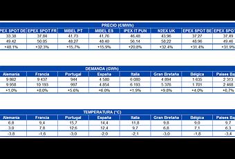 La semana del 23 de noviembre, los precios de todos los mercados eléctricos europeos analizados aumentaron respecto a los de la semana anterior. El mercado con la mayor subida de precios, del 401%, fue el mercado Nord Pool de los países nórdicos, seguido por el mercado EPEX SPOT de Alemania, con un aumento del 48%. En cambio, el mercado con el menor incremento de precios, del 16%, fue el mercado MIBEL de España y Portugal. En el resto de los mercados, los aumentos de precios estuvieron entre el 21% del mercado IPEX de Italia y el 32% de los mercados EPEX SPOT de Francia y los Países Bajos y del mercado N2EX de Gran Bretaña.