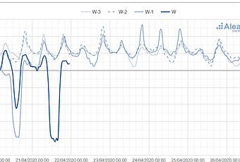 La combinación de una alta producción eólica, con una menor demanda eléctrica y precios más bajos de gas y CO2 que ha provocado la crisis del coronavirus, sigue teniendo como consecuencia caídas en los precios de los mercados eléctricos de Europa. Los días 19, 20 y 21 de abril se alcanzaron precios horarios negativos en los mercados de Alemania, Francia y Bélgica. Esta semana se espera que se mantengan los precios bajos en los mercados eléctricos aunque en algunos casos subirán respecto a la semana pasada