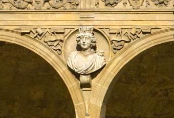 El bello patio está porticado y encima de cada uno de los apoyos se ha esculpido una alegoría femenina. Los atributos de las alegorías rodean en bajorrelieve simétricamente a los bustos.