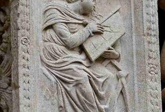 Las basas del pórtico superior tienen esculpidas las artes liberales como corresponde a un recinto universitario cuya función es la enseñanza. Teníamos curiosidad para comprobar si todas las representaciones seguían el modelo del llamado Tarot de Mantenga. No es así, más bien parece como si varios artífices hubieran trabajado en las esculturas hasta el punto de repetir la imagen de la Geometría: una sigue el Tarot y la otra parece seguir más el modelo de los grabados renacentistas flamencos.