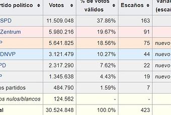 - La gran derecha clásica. Vieja aristocracia, grandes propietarios, financieros... Uno de sus lemas favoritos es “la mentira de Weimar”. Van a entrar en el juego parlamentario a través del Partido Nacional del Pueblo Alemán.