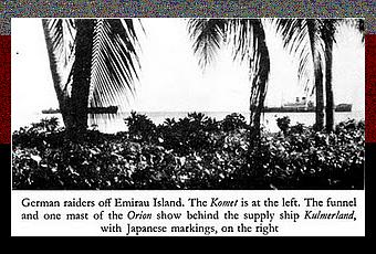 Los corsarios alemanes en la isla Emirau. El Komet se encuentra a la izquierda. La chimenea y un mastil del Orion puede verse detrás del buque suministro Kulmerland, con insignia japonesa, a la derecha.Este acto de magnanimidad humanitaria contrasta con la actitud del gobierno estadounidense, que acaba de rubricar con el Reino Unido un acuerdo comercial para la adquisición por parte británica de 750 millones de dólares de equipamiento militar. La lista de compra ha sido preparada bajo la petición del Presidente Roosevelt y los contratos entrarán en vigor cuando los aprueba el Congreso, un mero trámite.