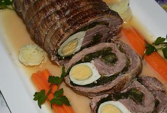 Ingredientes:Un kgr de aleta de ternera3 huevos150 gr de jamón cortado en lonchas400 gr de espinacas frescasun vaso grande de vino blanco de buena calidad200 mililitros de caldo o agua3 cebollasaceite, sal y pimienta