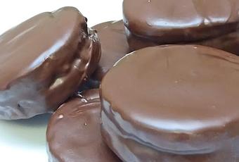 - Luego bañar en chocolate templado (yo lo derretí a baño maría pero se puede en microondas) sumergiendo el alfajor con 2 tenedores y dejándolos reposar en rejilla. Refrigerar una hora y a disfrutar!!!