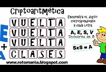 ALFAMETICA 1Nuestra primera alfamética los dice todo: VUELTA+VUELTA+VUELTA=CLASES, si estamos de vuelta a clases. Para esta criptoaritmética se dan unas pistas que claro hay que tener en cuenta.