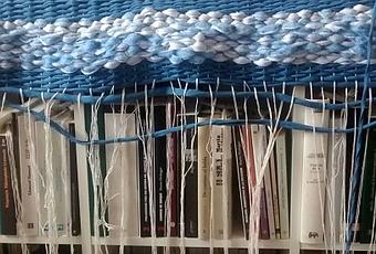 Mirad qué efecto tan bonito hacen los diferentes tonos de azul mezclados sin un orden determinado. El trapillo lo fuimos comprando de diferentes sitios, y guardándolo hasta que consideramos que teníamos la cantidad suficiente para realizar la alfombra. Me encanta ese aspecto rústico que tiene, parecen las olas del mar...