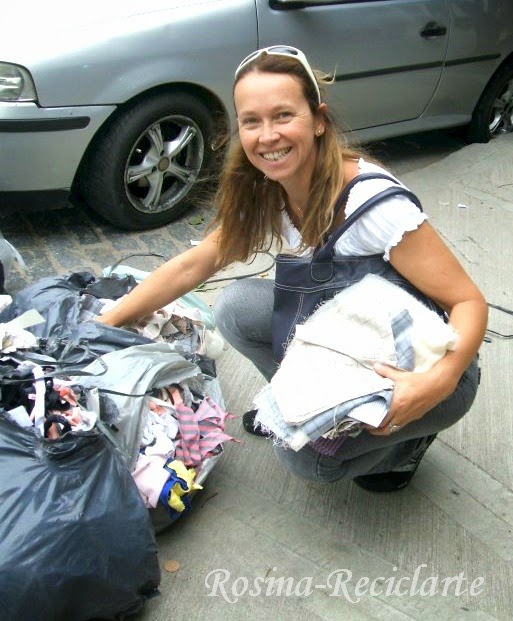Y si hay cosas tiradas en la calle allá voy yo y mi amiga Gabu a revolver. Traje documento fotográfico de hace un tiempo de una de nuestras expediciones cirujas .Mirá mi cara de alegría! parece que me hubiera ganado la lotería...Bueh una es así... se alegra por cosas tan simples(boludas)como toparse con muchas bolsas repletas de pedacitos de telas.En este proyecto ya había usado algunos retazos de esos que basureé,y como en el paquete venía mucho modal, ya sabía que iba a concretar la alfombra que hace tiempo quería hacer.