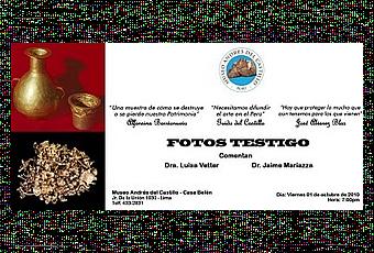 La muestra FOTOS TESTIGO estará todo el mes de octubre en el Museo Andrés del Castillo, que se está haciendo conocer por sus hermosos minerales cristalizados. Se ha previsto su traslado posterior a Cusco donde se exhibirá en la Escuela de Bellas Artes "Quispe Titu Inka".